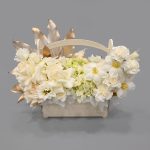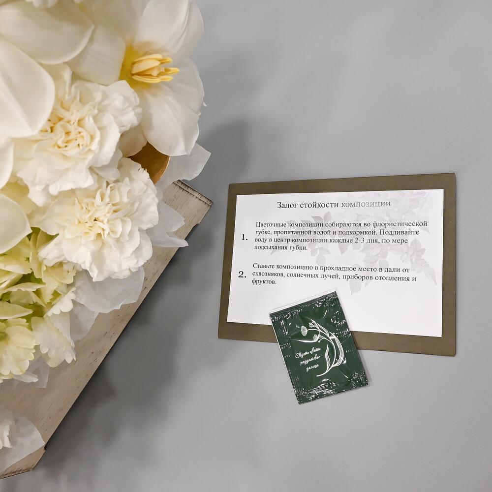 Французская роза – 3 шт.Эустома – 4 шт.Гвоздика – 7 шт.Тюльпан – 3 шт.Гортензия – 1 шт.Рускус – 5 шт.Аралия – 1 шт.Тишью – 2 шт.Ящик деревянный – 1 шт.