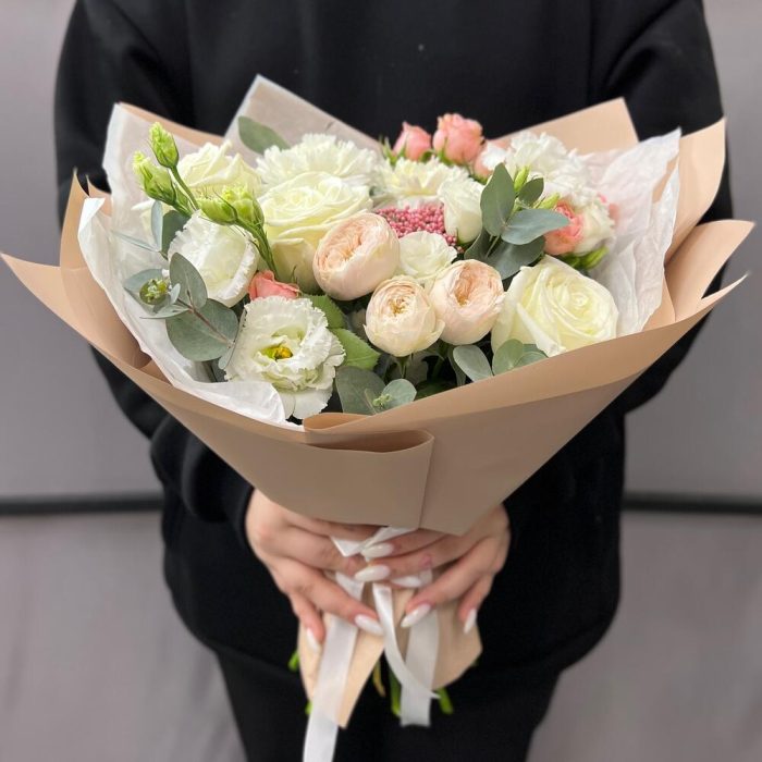 роза пионовидная плайа бланка – 3 шт.Роза кустовая пионовидная – 1 шт.роза кустовая мадам бомбастик – 1 шт.Озотамнус – 1 шт.Диантус – 2 шт.эустома махровая белая – 1 шт.эустома розита вайт – 1 шт.Эвкалипт – 2 шт.Тишью – 2 шт.Пленка матовая – 4 шт.Лента атласная – 2 шт.