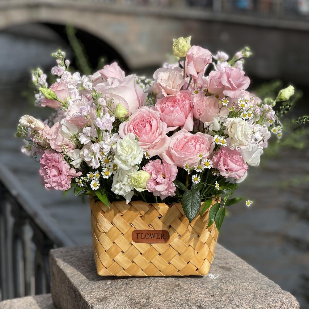 Лизиантус – 5 шт.Роза одноголовая – 5 шт.Роза пионовидная кустовая – 3 шт.Матрикария – 2 шт.Корзина плетеная – 1 шт.Маттиола белая – 8 шт.Оазис флористический – 1 шт.