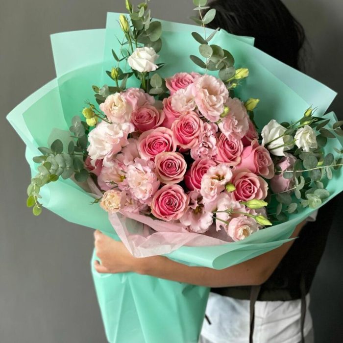 Авторский букет из розовых Пионовидных Роз и Эвкалипта