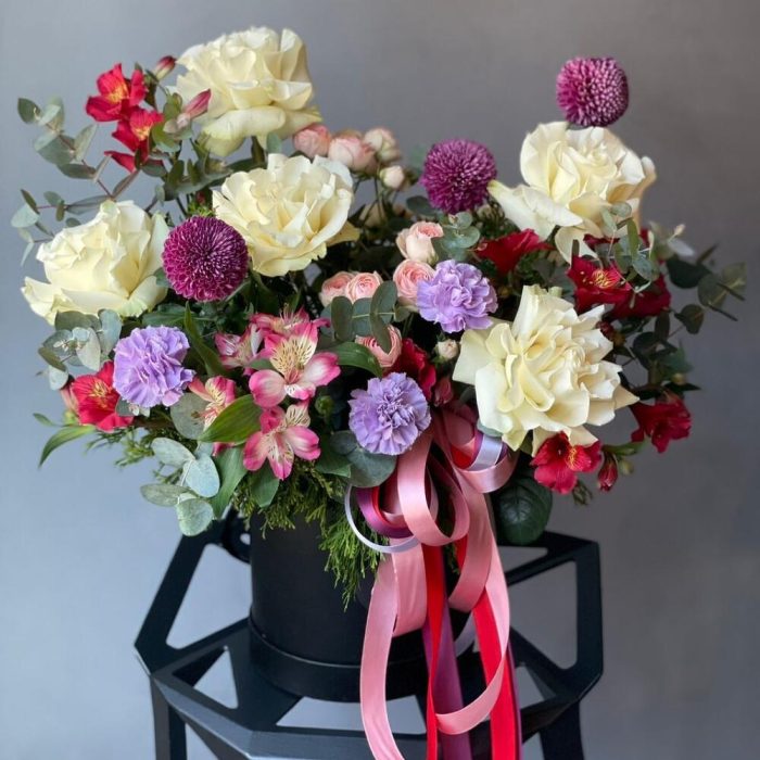 Коробка шляпная – 1 шт.Губка оазис – 3 шт.Хризантема – 3 шт.Альстромерия – 3 шт.Роза – 5 шт.Роза кустовая – 3 шт.Эвкалипт – 5 шт.Гвоздика – 3 шт.Лента атласная – 4 шт.