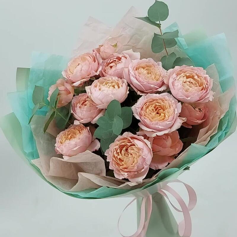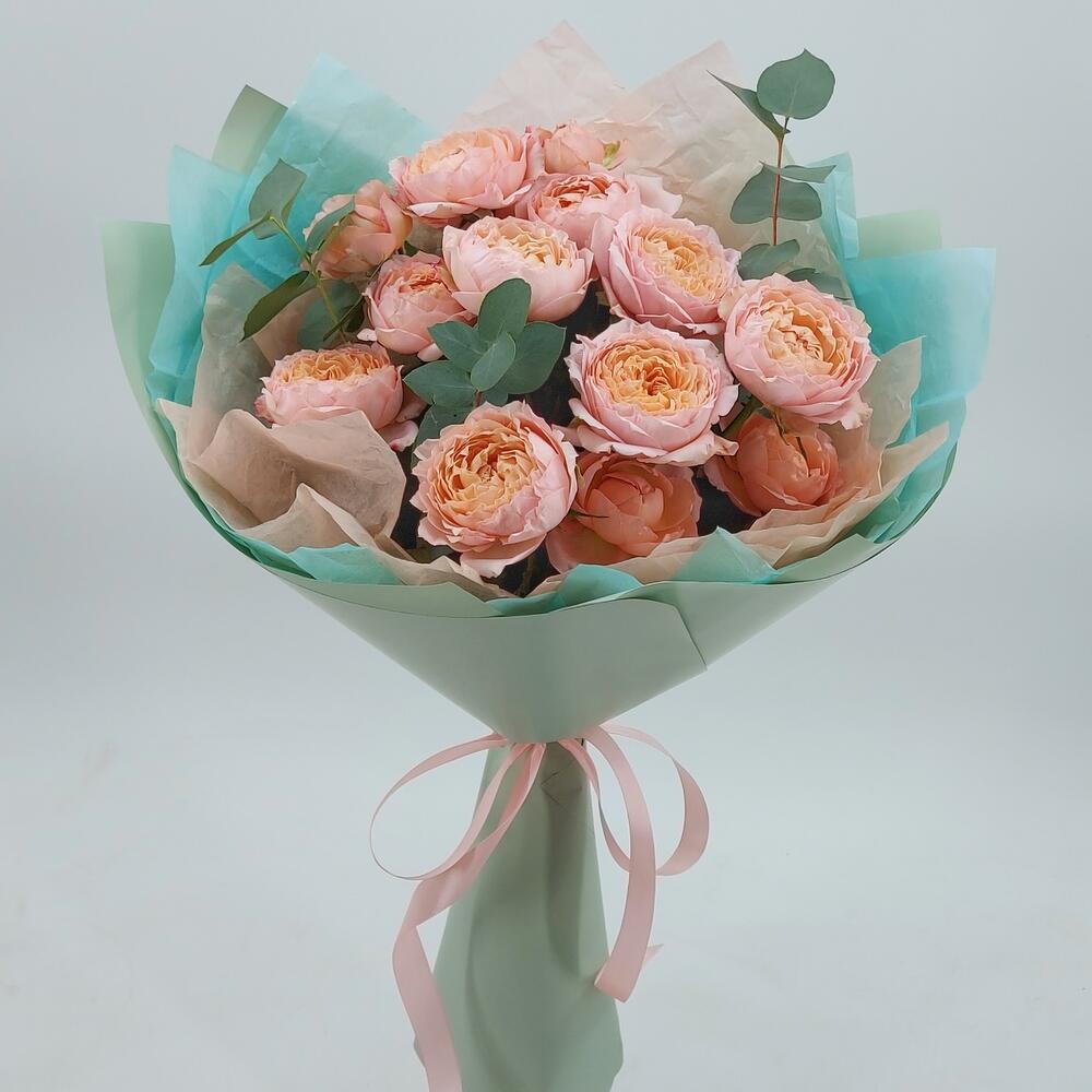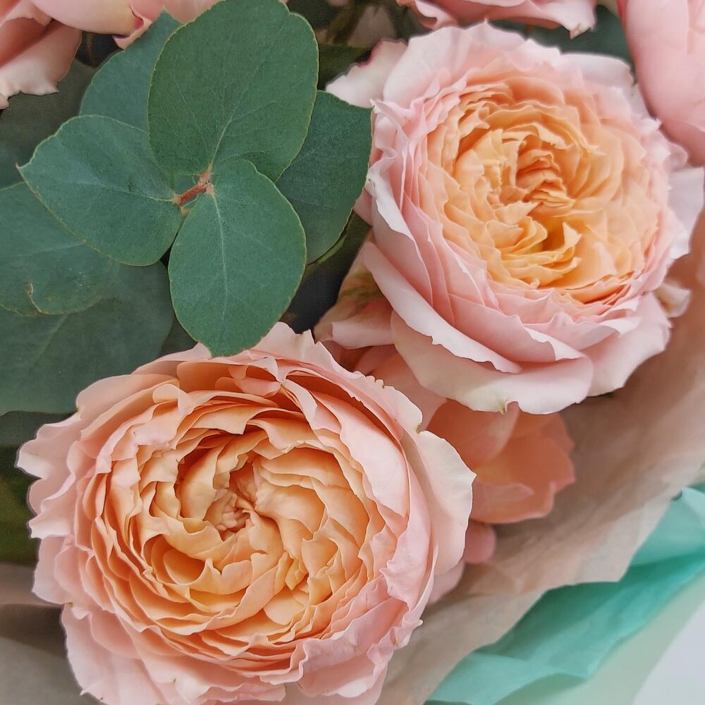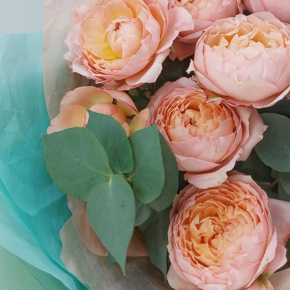 Эвкалипт – 3 шт.Упаковка дизайнерская – 1 шт.Роза кустовая пионовидная джульетта – 5 шт.