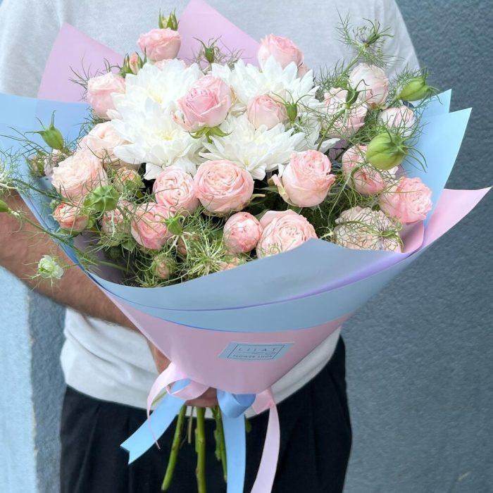 Spray rose – 7 шт. chrisantema – 7 шт. Decoration – 7 шт. packaging design – 1 шт. gift message card – 1 шт.
