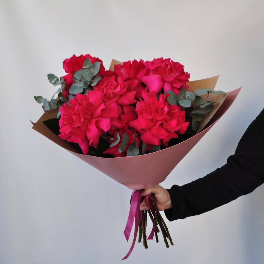 Эвкалипт – 1 шт.Лента атласная – 1 шт.Крафт – 1 шт.Роза французская пионовидная – 7 шт.Фоамиран (упаковка) – 1 шт.