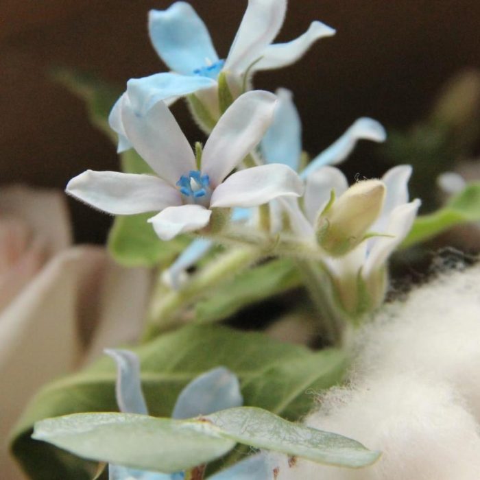 хлопок коробка – 5 шт.Пионовидная роза кустовая – 4 шт.Эвкалипт – 11 шт.Твидия – 5 шт.Снежноягодник – 3 шт.перец роза – 3 шт.Пионовидная роза – 11 шт.Лента атласная – 2 шт.