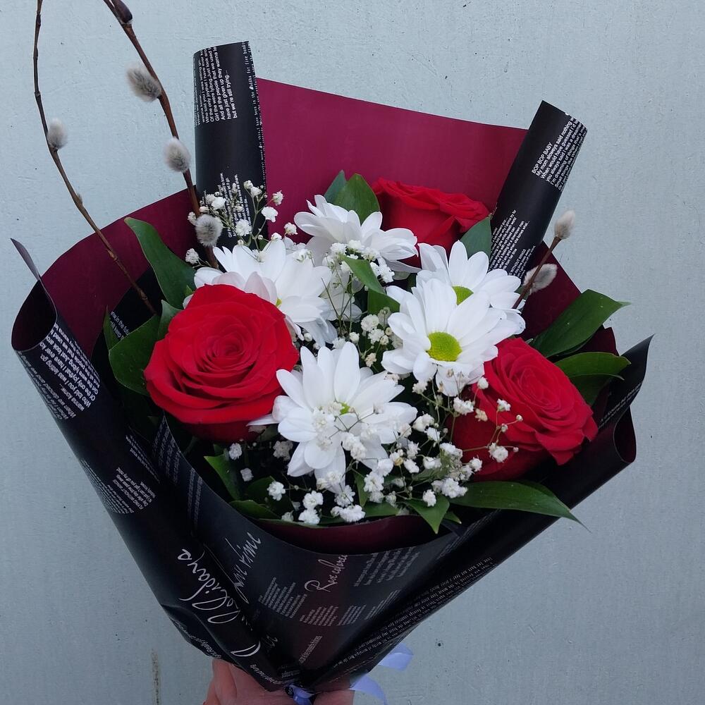 Роза Эквадор – 3 шт.Лента атласная – 1 шт.Упаковка дизайнерская – 4 шт.Рускус сочи – 10 шт.гипсофила белая – 1 шт.верба натуральная – 3 шт.бакарди ромашка хризантема кустовая – 1 шт.