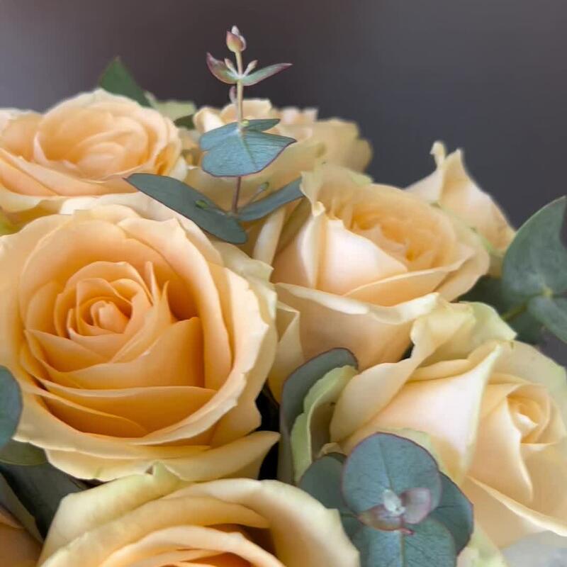 Композиция в коробке из 15 персиковых роз и ароматного эвкалипта