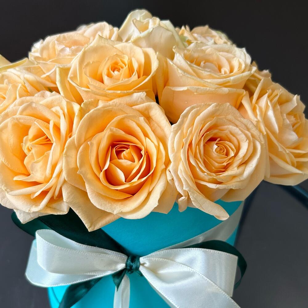 Композиция в коробке из 15 персиковых роз и ароматного эвкалипта