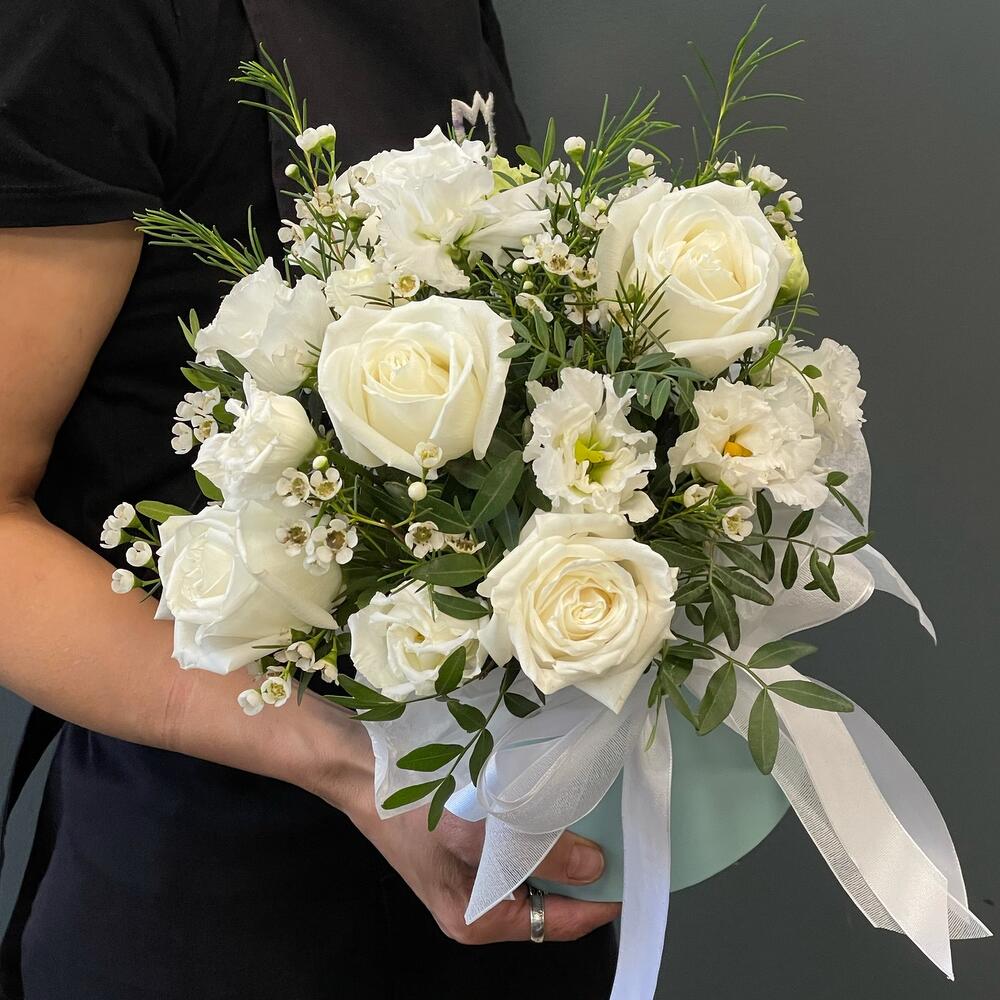 Композиция в шляпной коробке с белыми розами “Белоснежная”