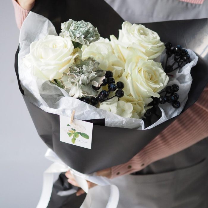 Гортензия – 1 шт.Роза одноголовая – 3 шт.Гвоздика сортовая – 2 шт.Декоративная ягода – 3 шт.Упаковка дизайнерская – 1 шт.