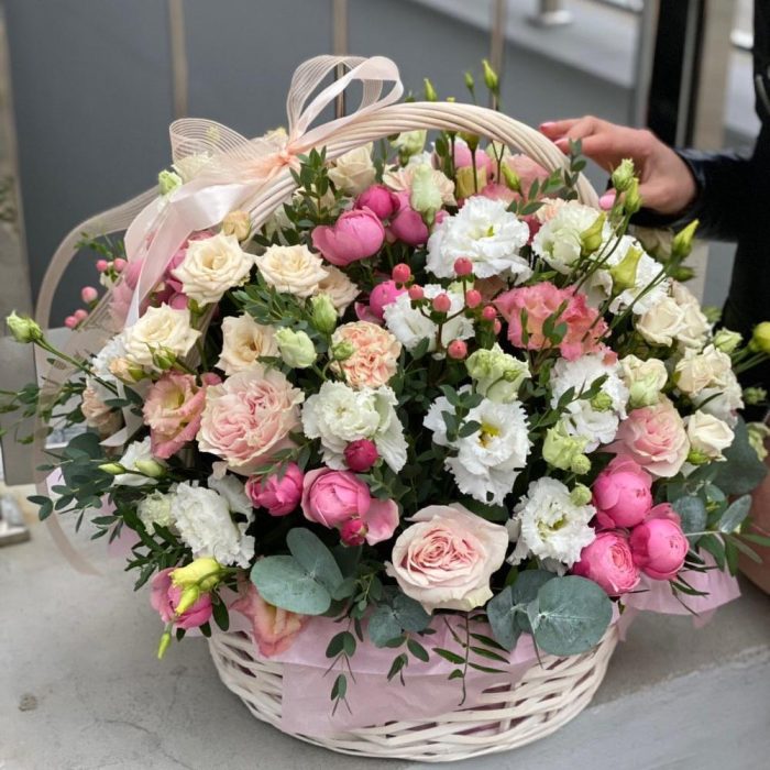 Эустома – 10 шт. роза розовая пинк мондиаль – 9 шт. Эвкалипт – 3 шт. Гиперикум – 5 шт. Гвоздика – 7 шт. кустовая роза таня – 5 шт. кустовая роза роял порцелина – 5 шт. кустовая пионовидная роза сильвия пинк – 8 шт. Корзина – 1 шт. Оазис – 6 шт. Оформление – 1 шт.
