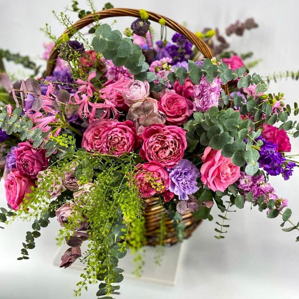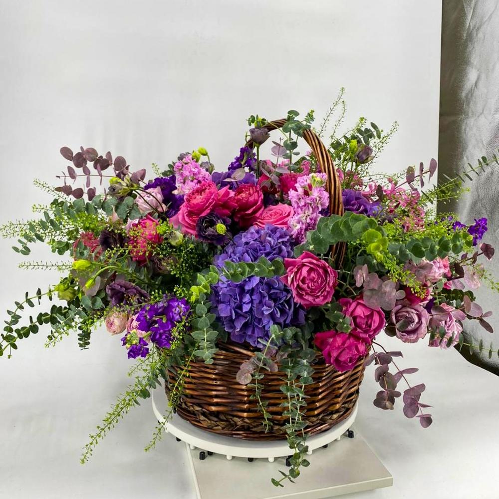 Гортензия – 2 шт.Маттиола – 15 шт.Роза Джульетта – 10 шт.Green bell – 10 шт.Эвкалипт – 10 шт.Аллиум – 1 шт.Гвоздика – 15 шт.