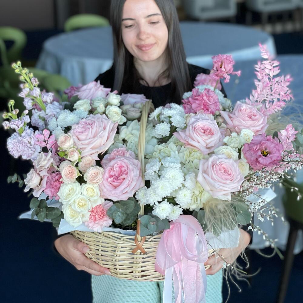 Тени в саду - Корзина с пионовидными розами, георгинами и дельфиниумом