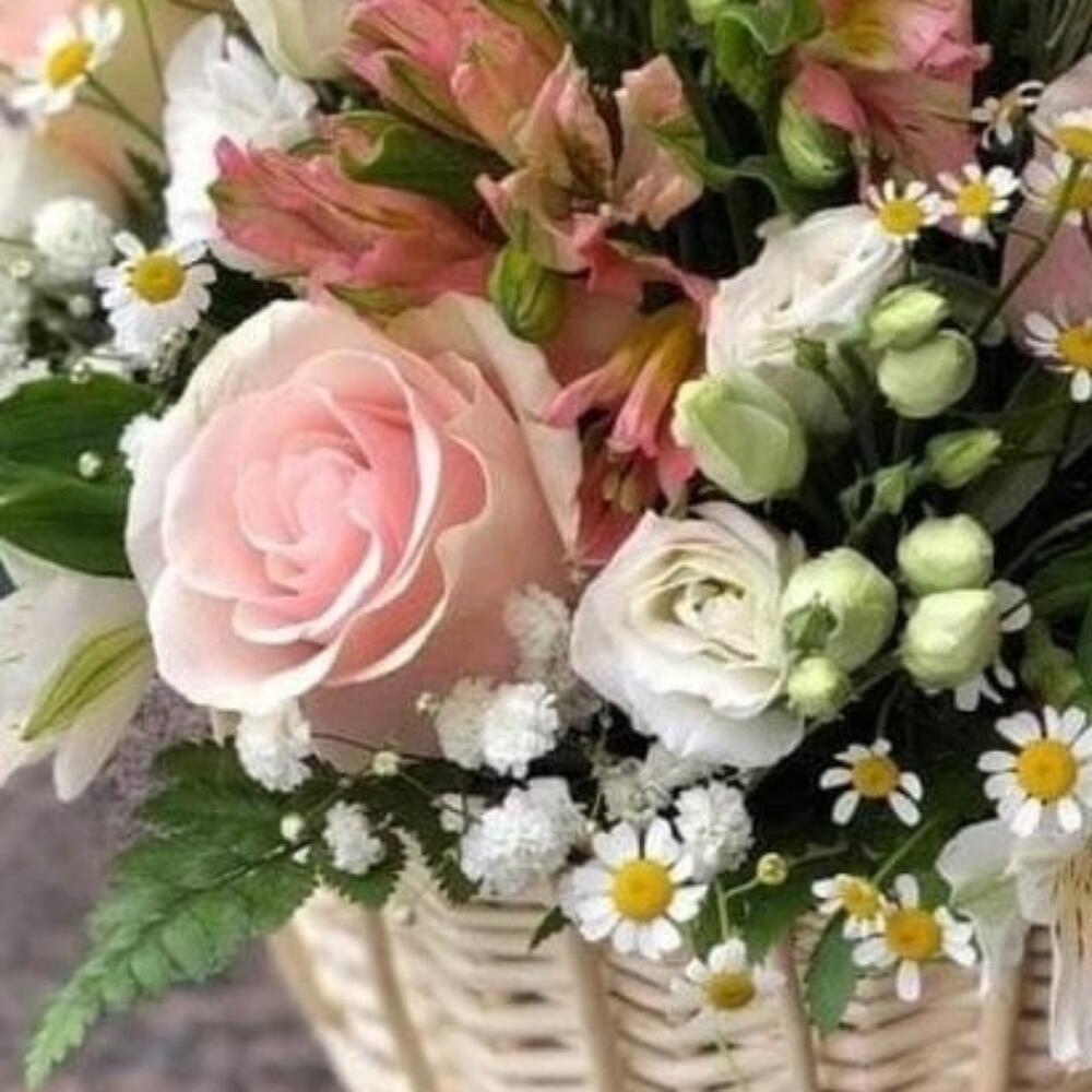 Роза – 7 шт.Альстромерия – 4 шт.Танацетум – 3 шт.Лизиантус – 2 шт.Гипсофила – 1 шт.зелень декоративная – 2 шт.Оазис флористический – 2 шт.Корзина плетеная – 1 шт.