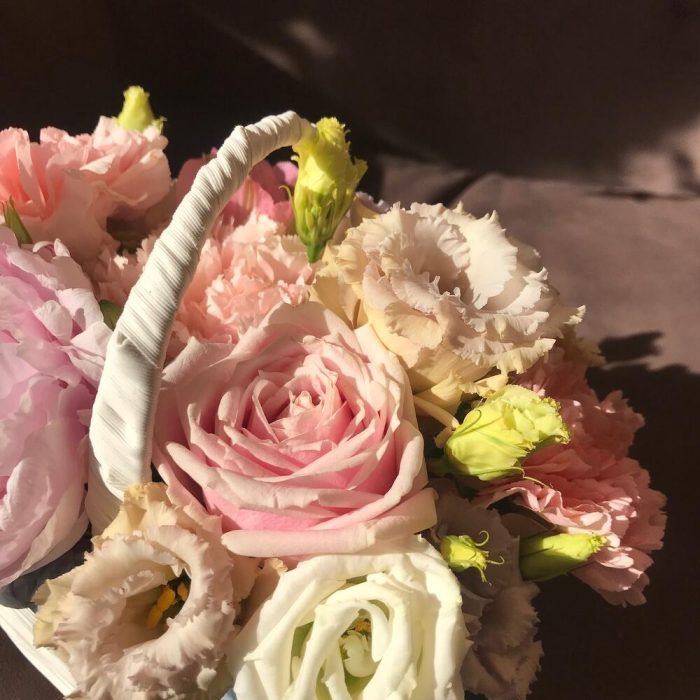 Корзина плетеная – 1 шт.Губка флористическая – 1 шт.Пион Сара Бернар – 1 шт.Роза розовая – 1 шт.Эустома – 2 шт.Гвоздика – 5 шт.