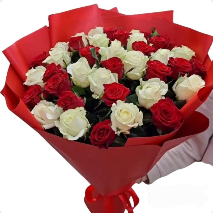 Роскошный букет из красных и белых роз в стильном оформлении будет по нраву каждой девушке. Если не знаете какой цвет роз нравится Вашей избраннице, то стоит выбрать данный букет с доставкой по Киеву или Киевской области.