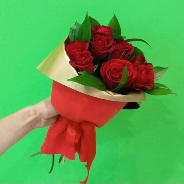 роза кения 50 см – 11 шт.Рускус – 7 шт.фоамиран лист – 1 шт.Лента атласная – 2 шт.