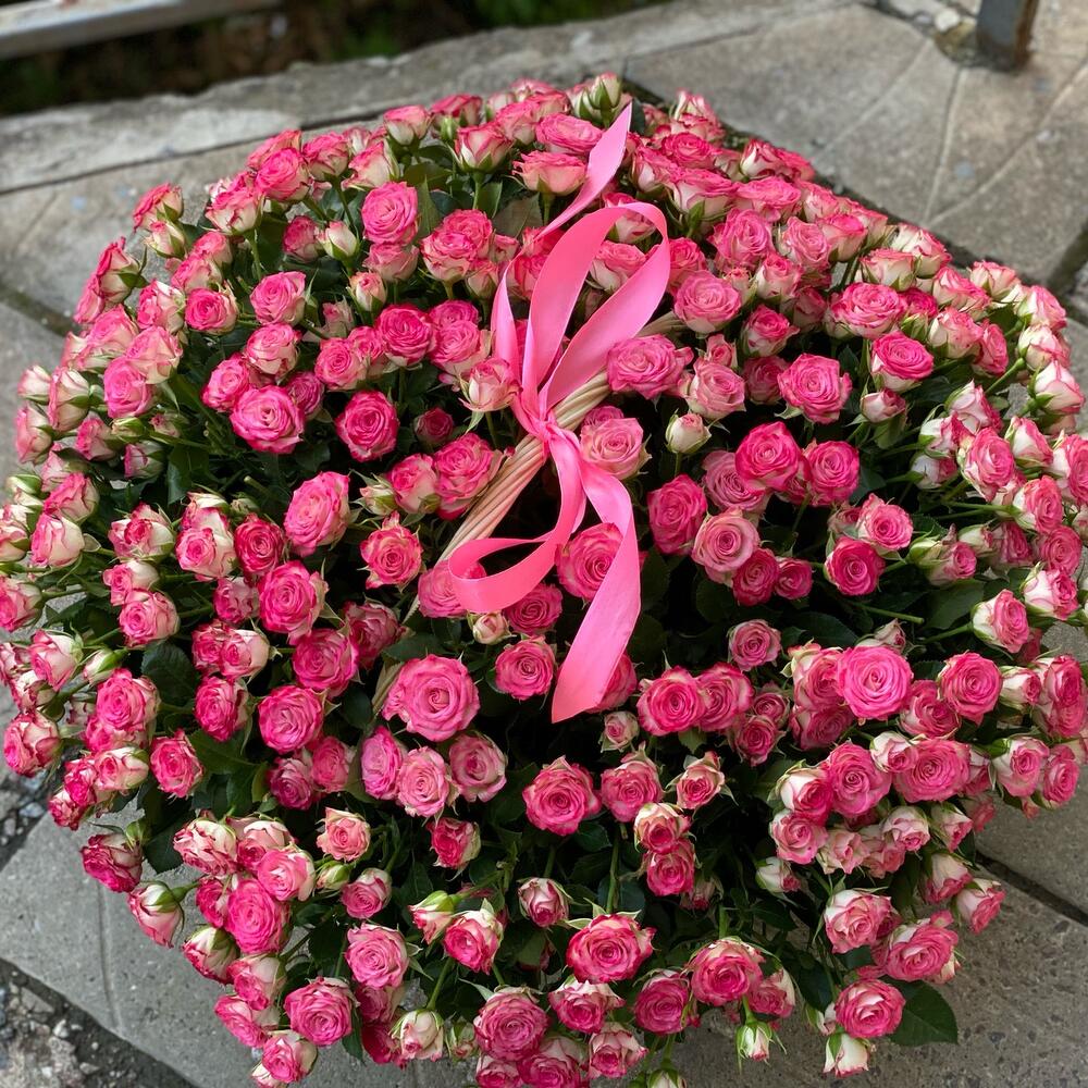Кустовая роза – 81 шт.Оазис флористический – 2 шт.Пленка – 1 шт.Корзина – 1 шт.