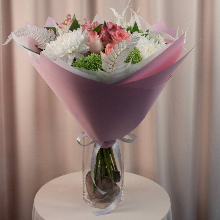 Альстромерия – 3 шт. Папоротник – 2 шт. Роза – 5 шт. Хризантема – 3 шт. Седум – 5 шт. Оформление – 1 шт.