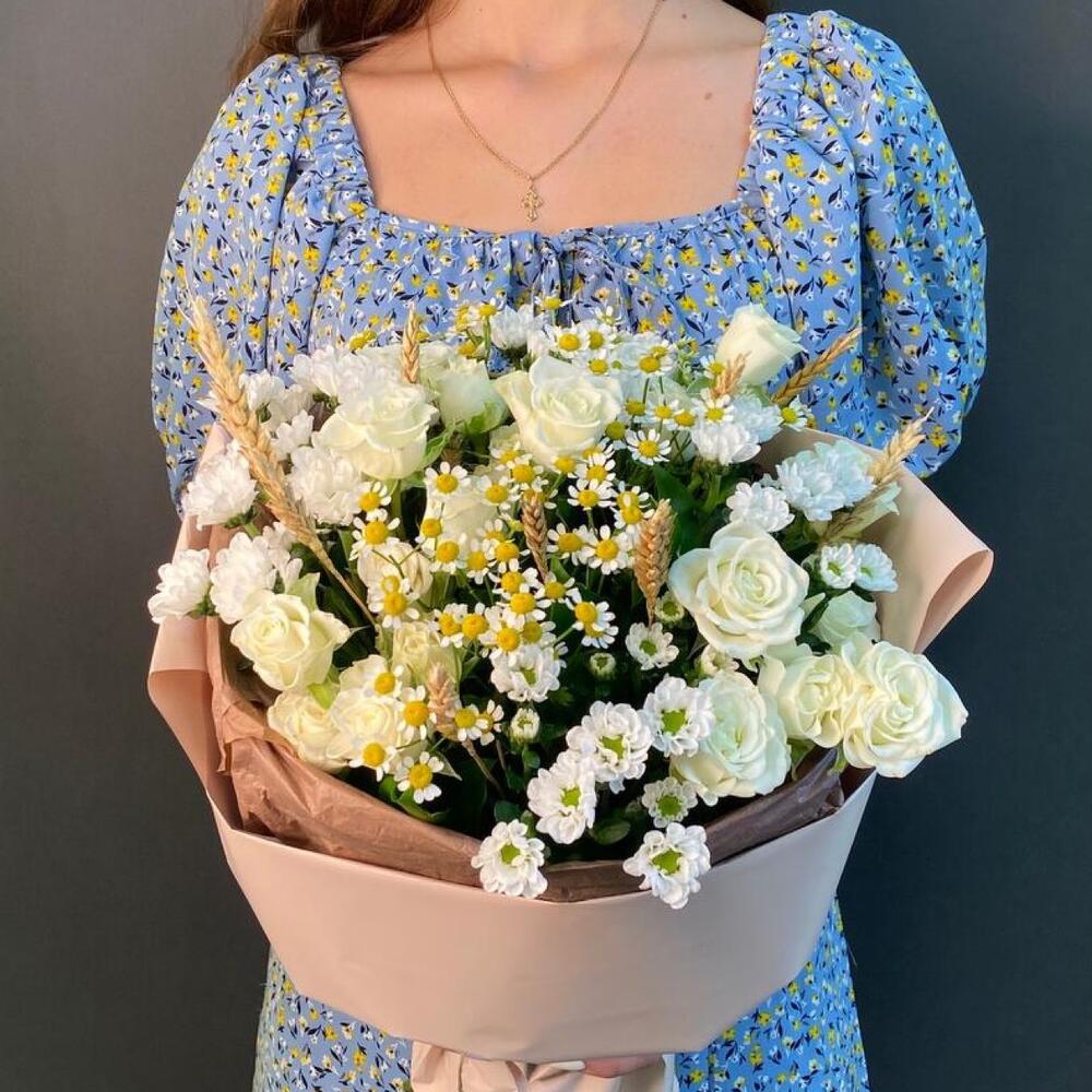 Роза кустовая – 3 шт.Ромашка кустовая – 4 шт.Сантини – 4 шт.Колосья пшеницы – 7 шт.Упаковка дизайнерская – 1 шт.зелень декоративная – 3 шт.