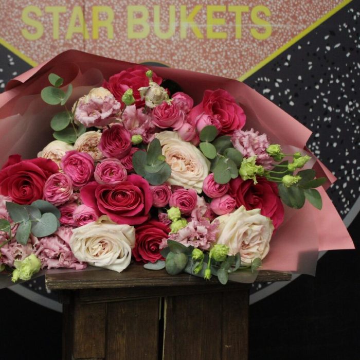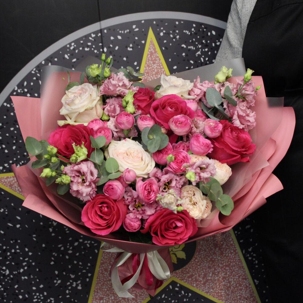 Роза Pink Floyd – 6 шт.white o’hara – 3 шт.giselle роза – 4 шт.mansfield park – 1 шт.эустома alissa pink – 4 шт.Эвкалипт – 3 шт.Пленка матовая – 6 шт.Лента атласная – 2 шт.