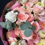 Лизиантус – 3 шт.Эвкалипт – 2 шт.Кустовая роза – 5 шт.Ранункулюс – 5 шт.Пионовидная роза – 4 шт.Атласная лента – 1 шт.Одноголовая роза – 13 шт.декоративная упаковка – 1 шт.