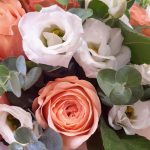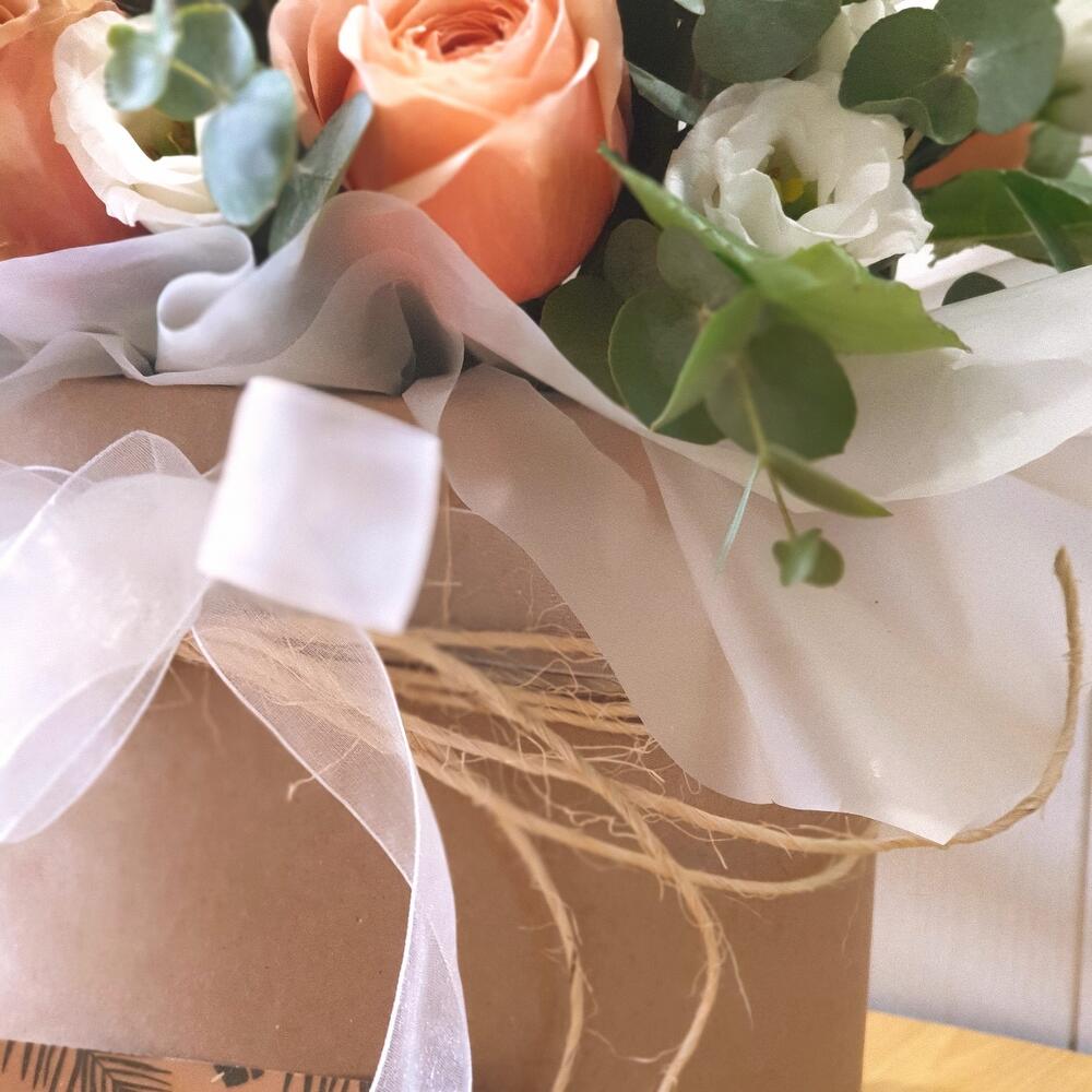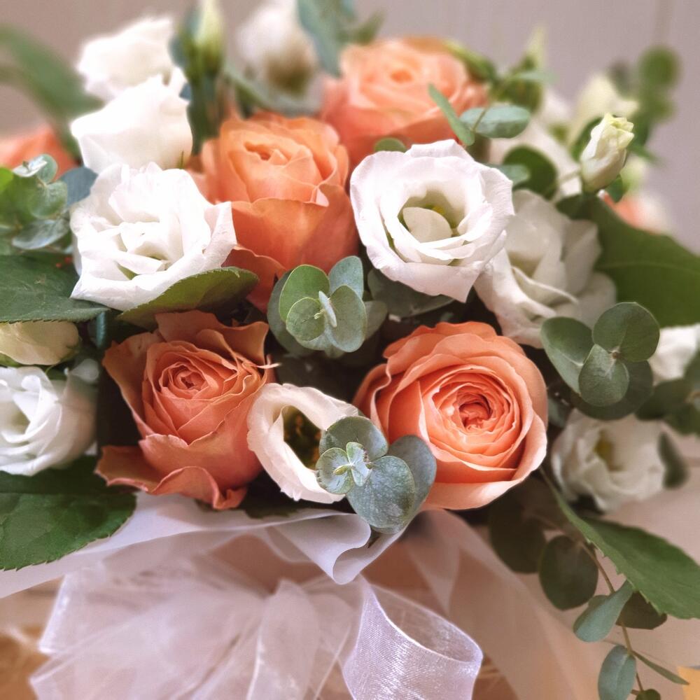Роза Капучино – 7 шт.Лента органза – 1 шт.Открыточка с вашими пожеланиями – 1 шт.Лизиантус Алиса белый – 4 шт.Оазис флористический – 1 шт.Эвкалипт Baby Blue – 3 шт.коробка шляпная крафт – 1 шт.рафия натуральная лента – 1 шт.любовь флориста (бесплатно) – 1 шт.