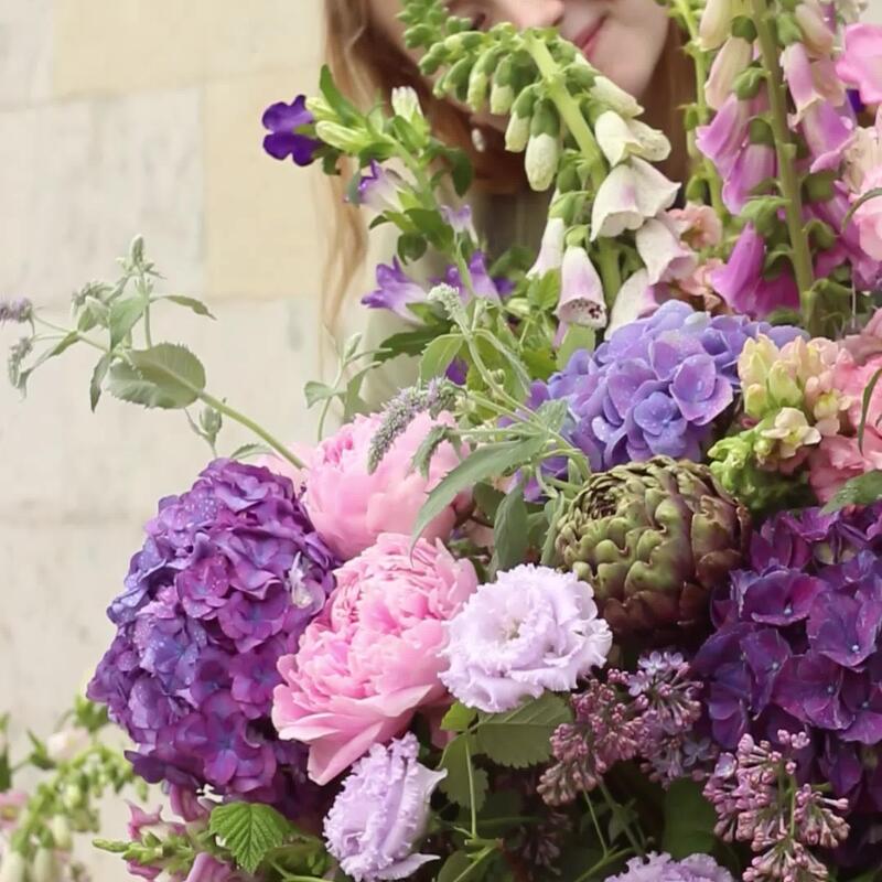 Гортензия – 5 шт.Пион – 9 шт.Роза пионовидная – 7 шт.Колокольчик – 3 шт.матиолы – 13 шт.Лизиантус – 9 шт.Наперстянка – 6 шт.Львиный зев – 7 шт.Сирень – 11 шт.Малина – 15 шт.Травы – 7 шт.Оазис флористический – 4 шт.Корзина – 1 шт.