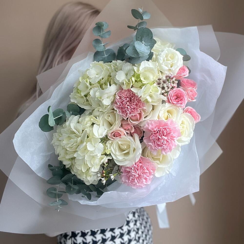 Гвоздики, Лизиантусы, Розы, Тюльпаны