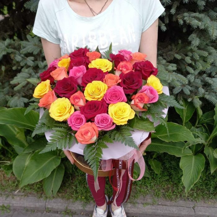 Роза разноцветная – 35 шт. форма сердца – 1 шт. Лента – 1 шт.
