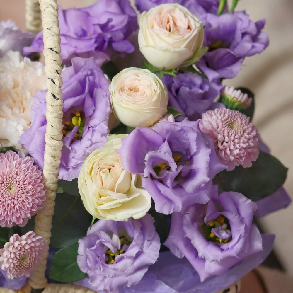 Сантини – 2 шт.Кустовая пионовидная роза – 2 шт.Корзина плетеная – 1 шт.Оазис флористический – 1 шт.Диантус лунный – 3 шт.эустома лавандовая – 2 шт.