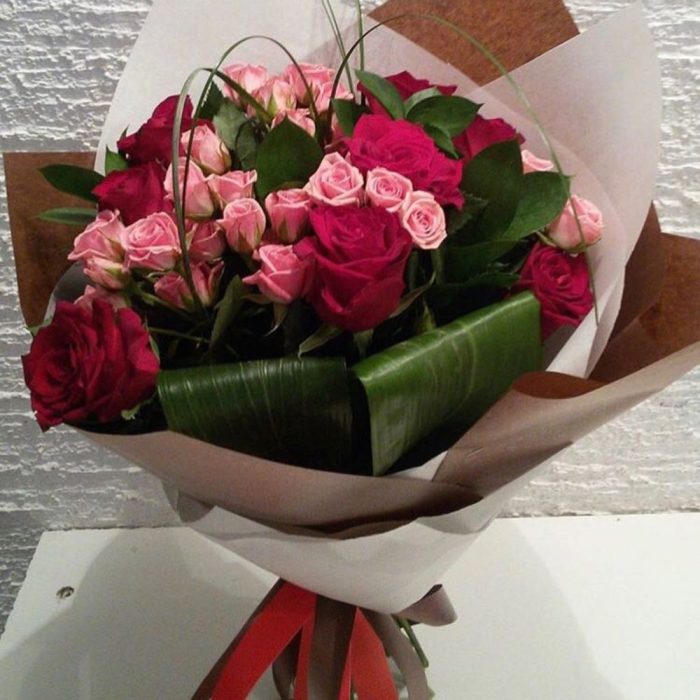 Аспидистра – 2 шт. Лента – 1 шт. Салал – 3 шт. Берграсс – 1 шт. Крафт – 2 шт. Роза кенийская 50 см – 9 шт. Роза кустовая местная 50 см – 3 шт.