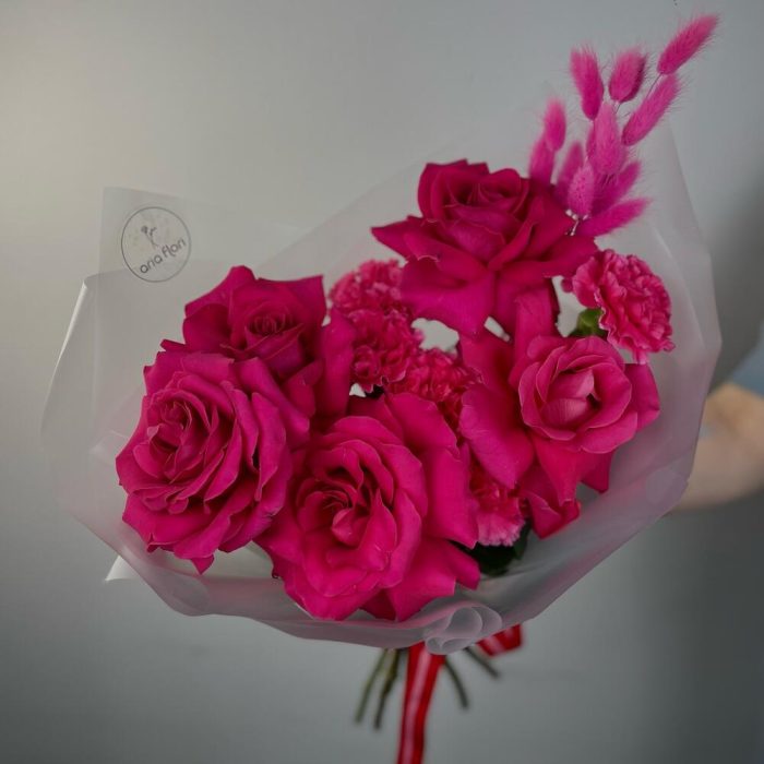 Множество малиновых оттенков в одном букете.Ароматные Розы Пинк Флойд в перемешку с гвоздиками и пушистым лагурусом. Мы используем для создания наших букетиков только качественный и свежий цветок Создаем букеты с невероятной любовью К букетику мы всегда прилагаем подкормку для цветочков – «chrysal”, чтобы они дольше сохраняли свою свежесть и красоту а также «Советы флористов» по уходу за срезанными цветочками Дополнительно к букетику Вы можете приобрести аквабоксы, транспортировочные коробки, крафтовые пакеты и вазы нужного размера