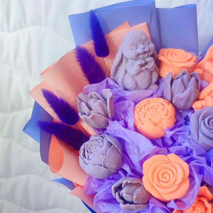 Лента атласная – 1 шт.Упаковка дизайнерская – 2 шт.Лагурус (сухоцвет) – 8 шт.белый бельгийский шоколад callebaut – 18 шт.