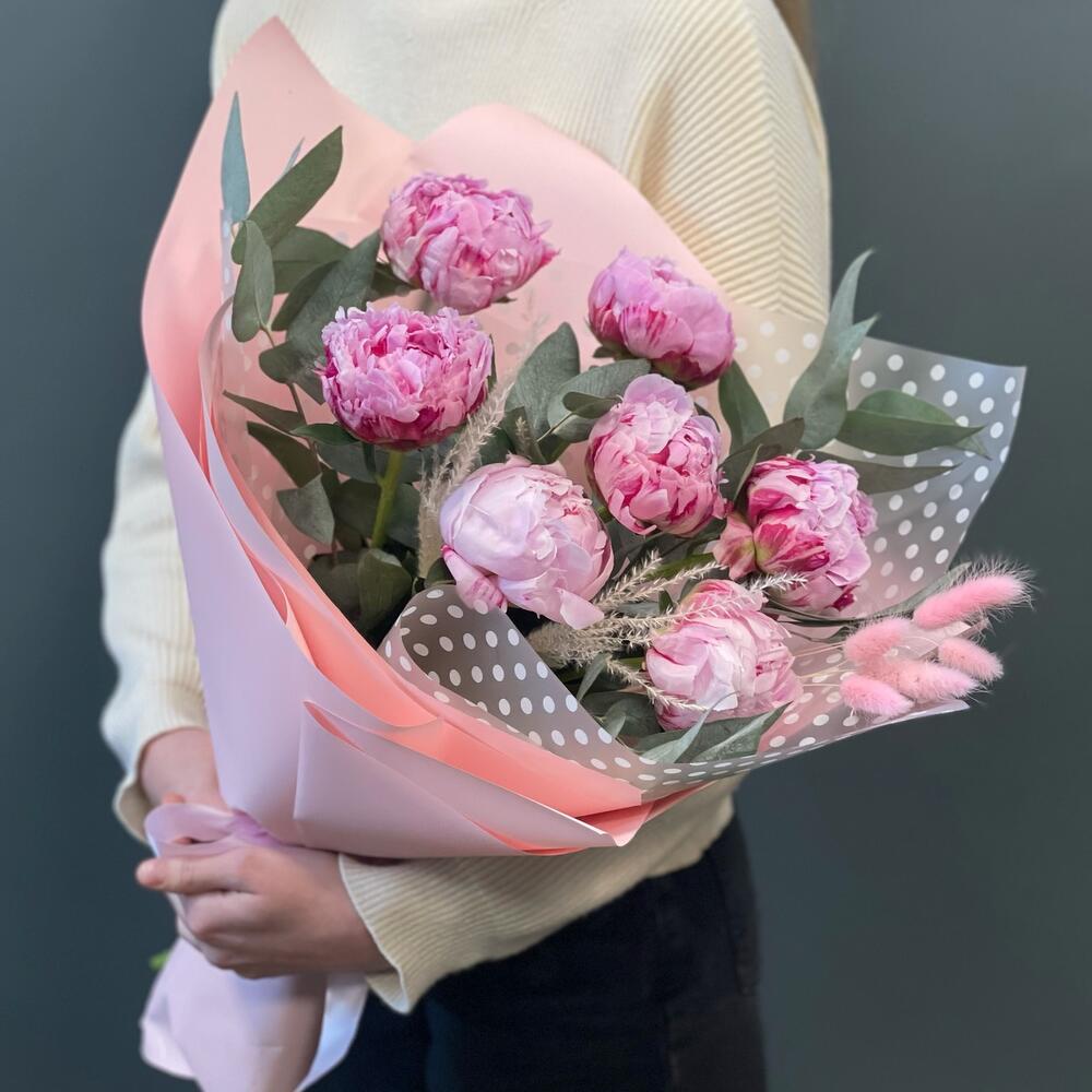Пион – 7 шт.Лагурус – 5 шт.Эвкалипт – 1 шт.пампасная трава (сухоцвет) – 1 шт.Упаковка дизайнерская – 1 шт.Лента – 1 шт.
