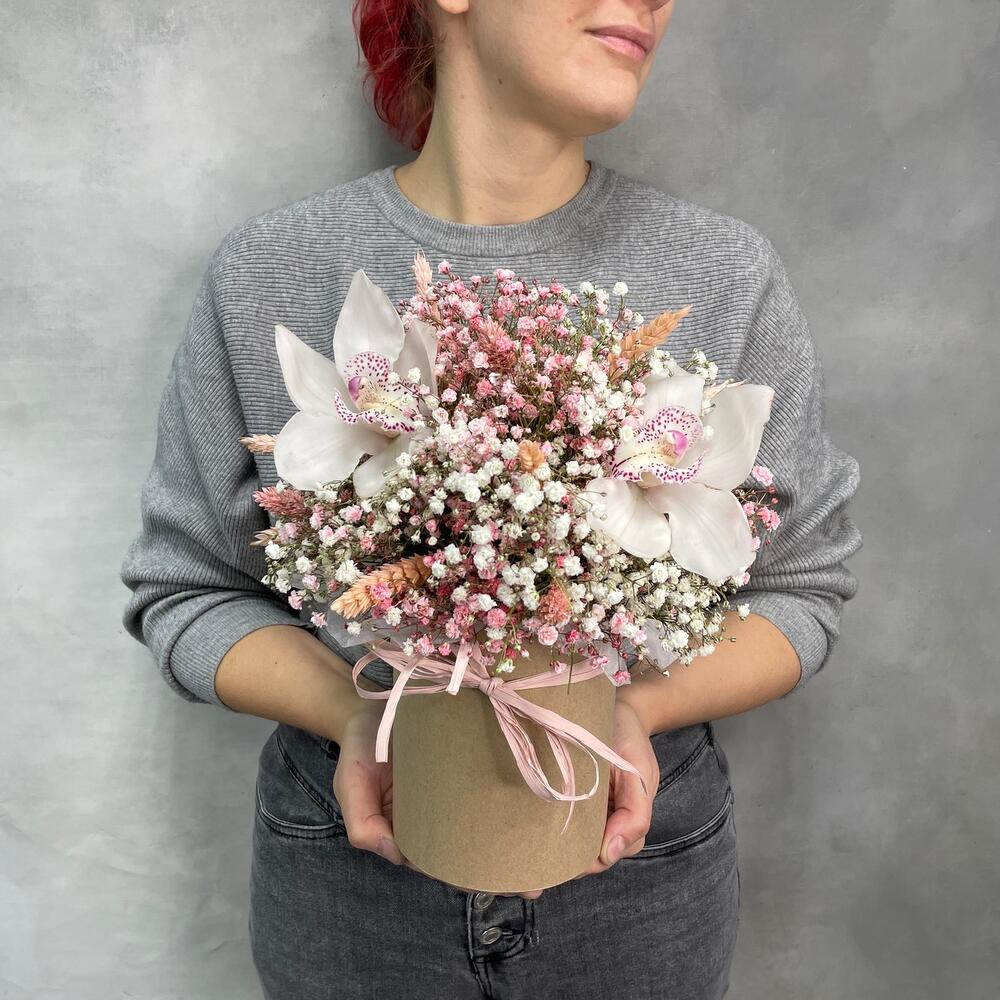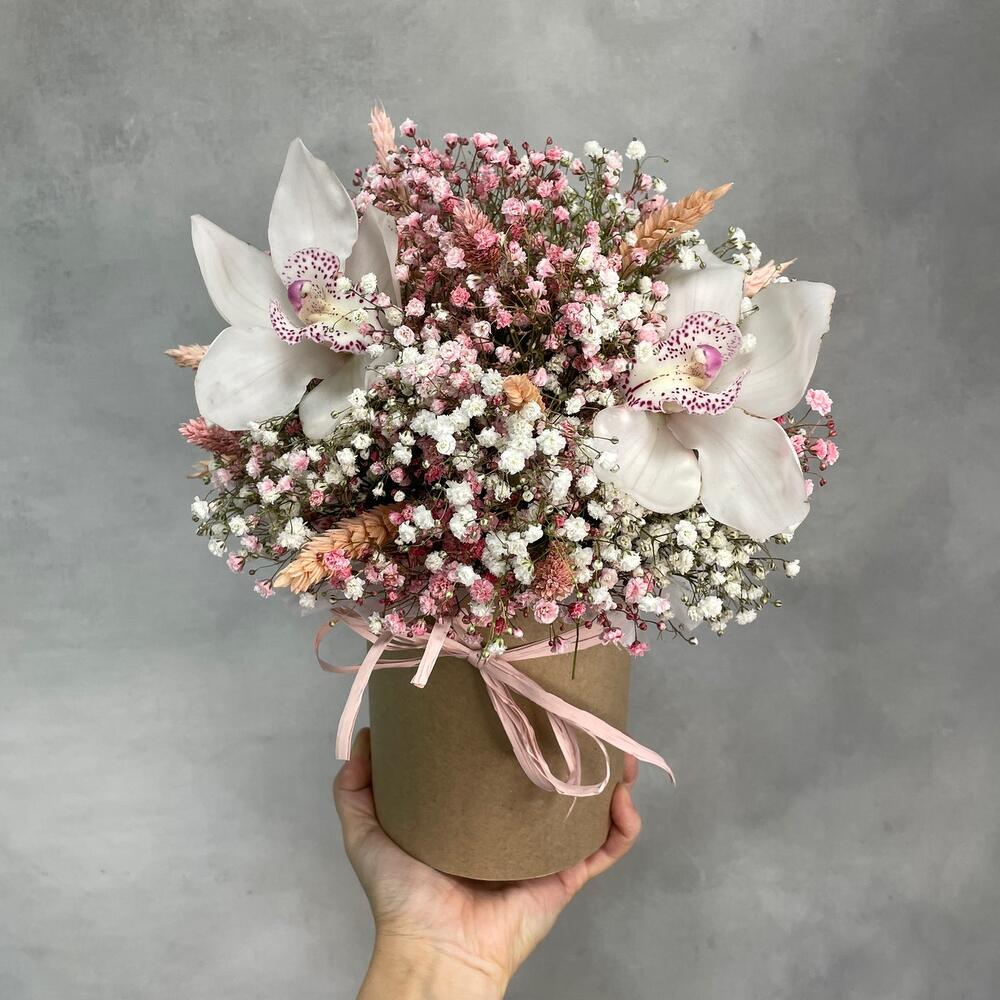 Гипсофила – 6 шт.Коробка – 1 шт.Орхидея цимбидиум микс – 3 шт.Лагурус (сухоцвет) – 11 шт.Пшеница (сухоцвет) – 9 шт.