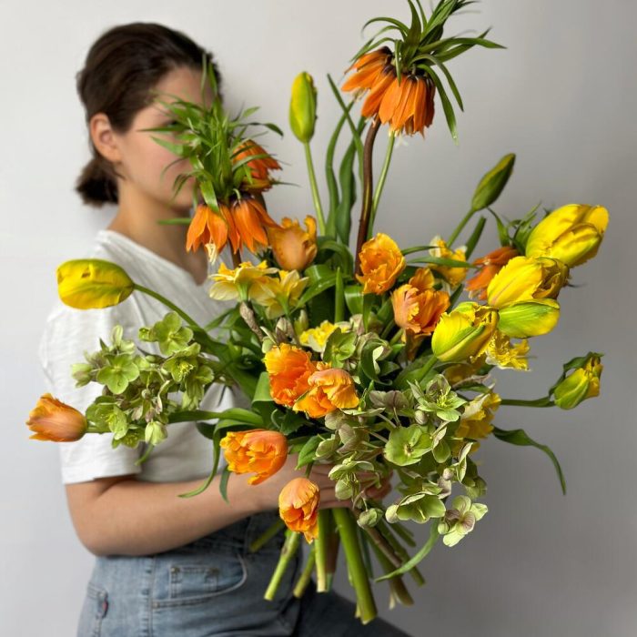 рябчик – 4 шт.Тюльпан желтый – 10 шт.Тюльпан оранжевый – 8 шт.Хелеборус – 3 шт.Нарцисс – 10 шт.