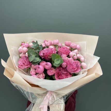 Букет из эустомы, гвоздики, цимбидиума, роз и альстромерии в дизайнерской упаковке “Белая сакура”