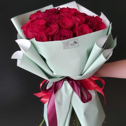 Букет из 31 персиковой эустомы (лизиантусов) в стильной упаковке “Каас”